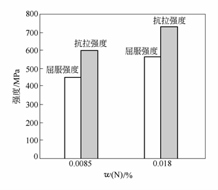 氮含量對鋼的強度有很大影響。圖4給出了氮對20MnSiV鋼強度影響的試驗結果。試驗結果表明,隨著氮含量的增加,V(C,N)析出的密度增大,析出顆粒尺寸減小,也就是說析出反應的化學驅動力增加,導致形核率增大。當鋼中的氮含量由0.0085%增加到0.018%時,在其他成分均保持不變的情況下,則鋼的屈服強度提高118MPa,抗拉強度提高135MPa,即增加鋼中的氮含量具有明顯的強化效果。