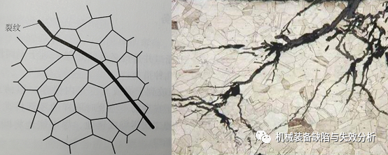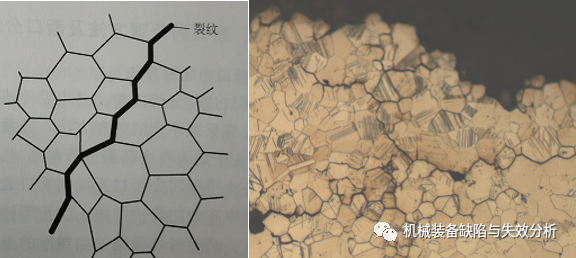 多晶體金屬斷裂時,裂紋擴展的路徑可能是不同的。根據(jù)裂紋擴展路徑,金屬的斷裂可分為穿晶斷裂和沿晶斷裂。穿晶斷裂的裂紋穿過晶內(nèi),沿晶斷裂的裂紋沿晶界擴展,如圖4、圖5所示。穿晶斷裂和沿晶斷裂有時可以同時發(fā)生。