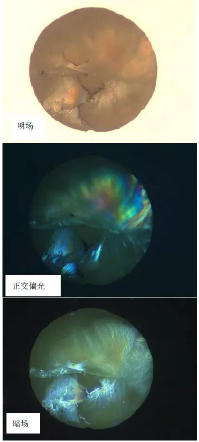 圖中所示為試樣中琉璃質球狀非金屬夾雜物在不同照明方式下通過顯微鏡觀察到的形貌。璀璨若星辰的玻璃質球狀夾雜物在正交偏振光下具有“暗十字”特征,在暗場下呈現“等色環”現象。千里之堤,潰于螞穴。非金屬夾雜物在金屬材料中就充當著這個“小螞蟻”的角色,它時時處處在影響著金屬材料的使用性能,所以材料的凈化也十分重要。