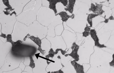 圖13 制樣過程中殘留在20鋼試樣表面的外來臟物,如箭頭所示。它和正常組織不在一個平面,屬于比較簡單、也好鑒別的制樣缺陷。