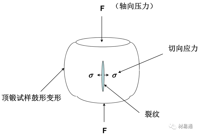 ①試樣頂鍛時易趨向變為鼓形,這是由于試樣兩端面受摩擦力影響而限制了試樣橫向變形所致。