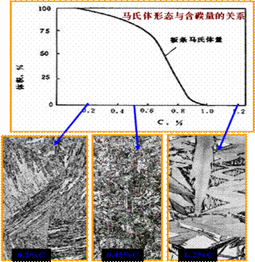當奧氏體過冷到Ms以下將轉變為馬氏體類型組織,是Fe原子和C原子都不擴散的非擴散型轉變,馬氏體轉變是強化鋼的重要途徑之一。馬氏體是碳在a-Fe中的過飽和固溶體稱馬氏體,用M表示。馬氏體轉變時,奧氏體中的碳全部保留到馬氏體中。