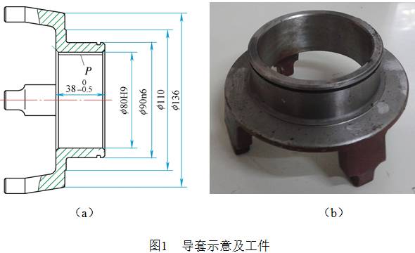 件名:導(dǎo)套,設(shè)計(jì)材料為:ZG35SiMn,P部要求感應(yīng)淬火,硬化層深度:1.5~2.5mm,表面硬度:52~60HRC,導(dǎo)套的示意如圖1所示。