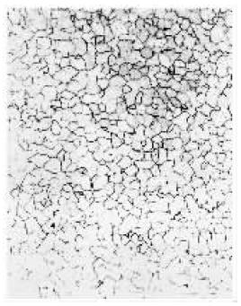 圖1:純鐵的基體組織,主要為白色鐵素體,晶粒均勻分布(6級),圖中黑色細(xì)條為晶界腐蝕線。