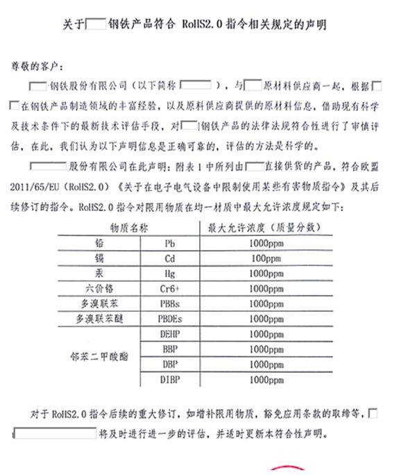 以下為某鋼廠關于歐盟RoHS 2.0指令聲明的中文版范例。