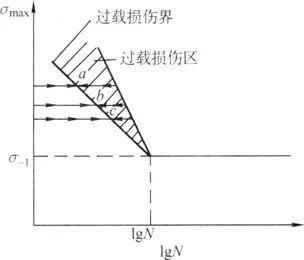 所謂超載損傷是指材料在高于疲勞極限的載荷下運行達到一定周次后,將造成材料疲勞極限的下降。超載越高,造成損傷所需的周次越短,如圖1所示。