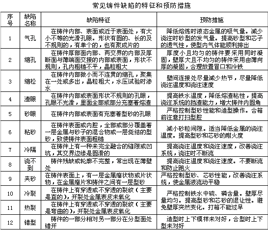 鑒定鑄件的質量,不僅僅是為了發現缺陷和對質量進行分級,更重要的是要找出產生缺陷的原因,制定出預防缺陷產生的技術措施和組織措施。常見鑄件缺陷的特征和預防措施見下表。