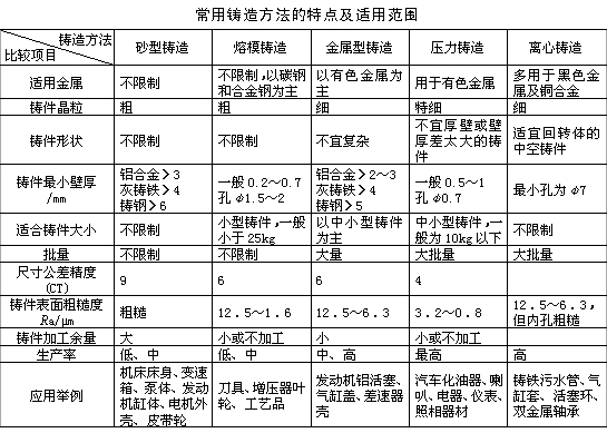 鑄造方法很多,應根據鑄件的結構特點、形狀、尺寸大小、合金種類、技術要求及設備等具體條件進行全面分析比較,合理選擇,才能達到優質、高產、低成本的目的。常見鑄造方法的特點及適用范圍見下表。