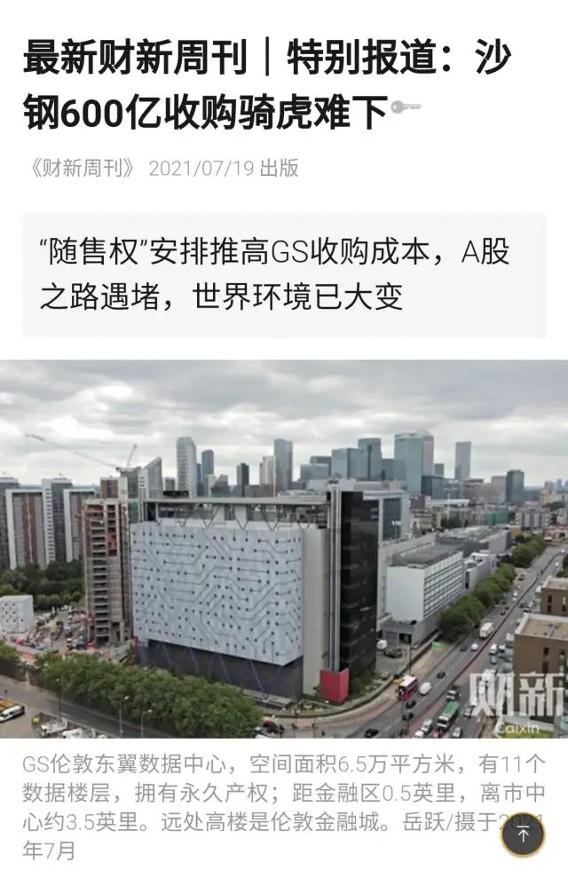 2015年初,沙鋼集團(tuán)突然甩賣旗下上市公司沙鋼股份55.12%股權(quán)給9名自然人,套現(xiàn)約46億元,僅保留了20%左右的股權(quán)控股。這也被視為沙鋼集團(tuán)轉(zhuǎn)型、沙鋼股份系列重組的前奏。2015-2017年也是中國企業(yè)跨行業(yè)、跨境收購的高峰期。很快,沙鋼股份就開始籌劃收購數(shù)據(jù)中心等資產(chǎn),但并沒有談妥。在尋找收購目標(biāo)的過程中,沙鋼集團(tuán)逐漸發(fā)現(xiàn)了英國的數(shù)據(jù)中心運(yùn)營商GS項(xiàng)目。GS成立于1998年,后被英國億萬富豪魯本兄弟(印裔)在2004年收購,逐漸成為全球第三大數(shù)據(jù)中心運(yùn)營開發(fā)商,并隨著歐洲市場逐漸成熟,GS在香港、新加坡、悉尼等亞太核心城市也建設(shè)數(shù)據(jù)中心,進(jìn)入高增長的亞太地區(qū)。最先談下GS項(xiàng)目的并不是沙鋼集團(tuán),而是一家名不見經(jīng)傳的中國數(shù)據(jù)中心“新軍”:2009年才成立的德利訊達(dá)。德利訊達(dá)際控制人李勇,則是在2015年初入股沙鋼股份的9名自然人之一。德利訊達(dá)在2015年曾欲賣給上市公司四川金頂(600678.SH),這家從未盈利過的公司估值卻高達(dá)28億元,并承諾以后每年數(shù)億元的利潤,不過四川金頂最后發(fā)現(xiàn),這家公司聲稱可以拿下的項(xiàng)目政府批文遲遲拿不下來,于是終止了收購。但德利訊達(dá)的另一個(gè)大動(dòng)作卻神奇成功了。2015年10月,李勇和魯本兄弟達(dá)成了收購GS公司51%股權(quán)的意向,并在次年初成立蘇州卿峰作為平臺募集收購資金,由于德利訊達(dá)實(shí)力薄弱,在募資過程中沙鋼集團(tuán)成為了蘇州卿峰的資金主力。這也給了沙鋼集團(tuán)在此后全面介入的機(jī)會(huì)。中國證監(jiān)會(huì)2019年的一份行政處罰決定書披露,2016年6月,李勇和GS公司簽訂了收購協(xié)議。當(dāng)年8月,李勇和沙鋼控股投資公司總裁聶蔚等人在上海聚餐時(shí),聶蔚代表沙鋼股份實(shí)際控制人沈文榮詢問李勇,是否可以將德利訊達(dá)和蘇州卿峰裝入沙鋼股份,李勇表示同意。2016年9月,沙鋼股份停牌宣布將收購IDC大數(shù)據(jù)資產(chǎn),當(dāng)年11月,沙鋼股份披露標(biāo)的資產(chǎn)即為蘇州卿峰和德利迅達(dá)。按照此后披露的方案,蘇州卿峰持有德利訊達(dá)12%股權(quán),沙鋼股份計(jì)劃收購蘇州卿峰100%股權(quán)和德利訊達(dá)的另88%股權(quán)。沙鋼集團(tuán)的目標(biāo)則是收購整個(gè)GS公司。沙鋼集團(tuán)2020年中期票據(jù)募集說明書披露,沙鋼集團(tuán)牽頭的財(cái)團(tuán)并購GS項(xiàng)目,先后進(jìn)行了三次股權(quán)收購。第一次是沙鋼集團(tuán)聯(lián)合中航信托等組建蘇州卿峰(注冊資本217.54億元),收購了GS的51%股權(quán),交易對價(jià)為23.42億英鎊。第二次是沙鋼集團(tuán)境外全資子公司沙鋼國際(香港)通過入股SPV公司Strategic IDC LTD與其他投資人共同收購了GS 24.99%股權(quán),交易對價(jià)17.95億英鎊,其中沙鋼集團(tuán)自有資金7億美元,SIL向信銀國際融資13億美元。(沙鋼集團(tuán)和其他境外投資人分別持有SIL的40.94%、59.06%股權(quán))第三次是沙鋼集團(tuán)通過境外全資孫公司Tought Expert完成了對GS最后24.01%股權(quán)的收購,交易對價(jià)18億英鎊。至此,沙鋼集團(tuán)用自有資金加上撬動(dòng)外部資本,以60億英鎊收購了GS公司100%股權(quán),這也是中國企業(yè)近年來最大的跨境并購項(xiàng)目之一。魯本兄弟當(dāng)初收購GS項(xiàng)目僅花了5億多英鎊,又投入超過10億英鎊擴(kuò)大業(yè)務(wù),最終賺得盆滿缽滿。