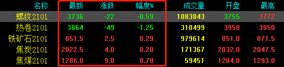 期螺跌22收報3736,期卷跌49收報3864,鐵礦石漲2.5收報851.5,焦炭漲4收報2022.5,焦煤漲9收報1286。