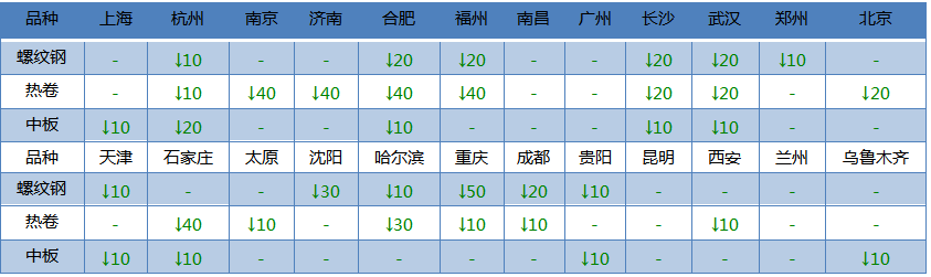 螺紋鋼24個市場中12個市場下跌10-50, 20mmHRB400E平均價格3782元/噸,較上個交易日下調10元/噸。
