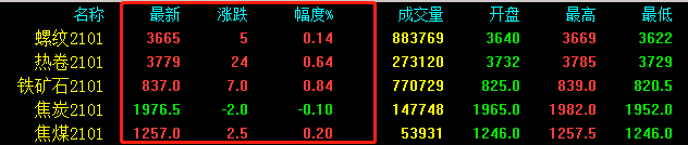 期貨翻紅,期螺漲5收報3665,期卷漲24收報3779,鐵礦石漲7收報837,焦炭跌2收報1976,焦煤漲2.5收報1257。