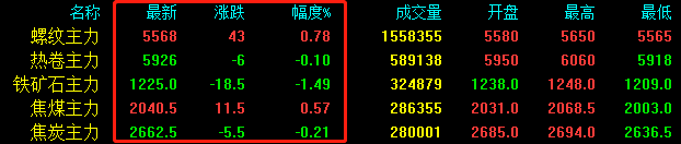今日期鋼上漲遇阻,早盤漲勢明顯,午后高位回落。期螺上漲43收報5568,期卷下跌6收報5926,鐵礦石下跌18.5收報1225,焦煤上漲11.5收報2040.5,焦炭下跌5.5收報2662.5。