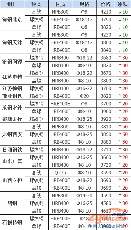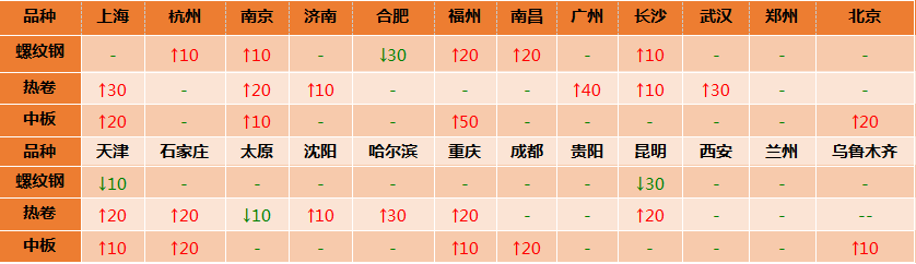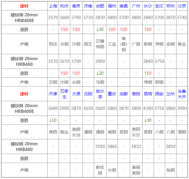 螺紋鋼24個(gè)市場(chǎng)中5個(gè)市場(chǎng)上漲10-20,2個(gè)市場(chǎng)下跌10-30,20mmHRB400E平均價(jià)格3805元/噸,較上個(gè)交易日價(jià)格相同;