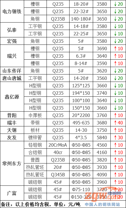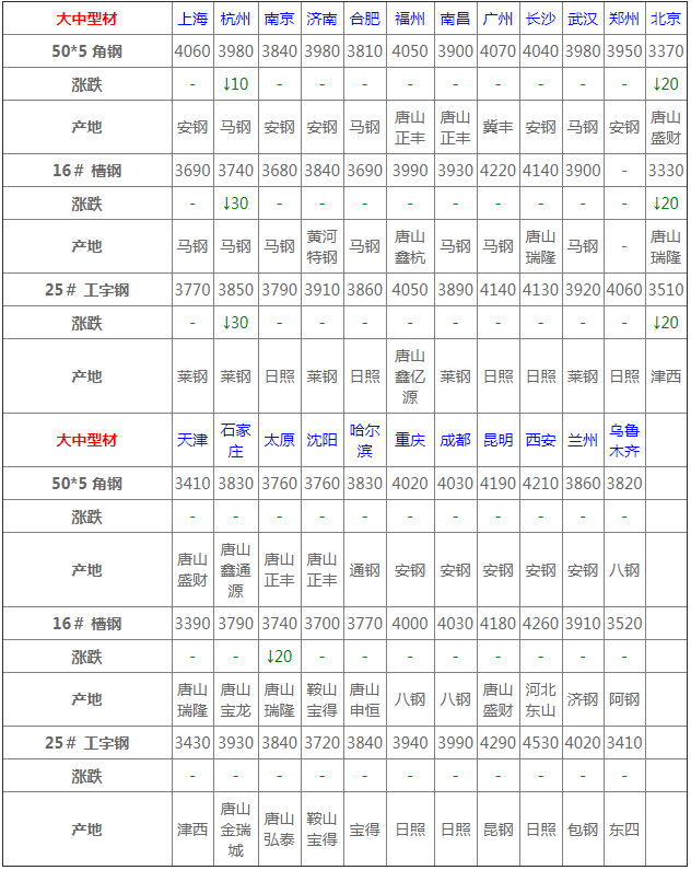 Periquito 三個(gè)礦區(qū))生產(chǎn),該舉將影響淡水河谷至少10%的產(chǎn)量。 1 6月8日建材價(jià)格:穩(wěn)中小漲10-20元/噸; 今建材價(jià)格主流偏強(qiáng),早盤期螺持紅震蕩,加之鋼坯端今晨拉漲20提振市場(chǎng)信心,普遍跟隨上調(diào)10-20左右。漲后市場(chǎng)交投氛圍平平,商戶心態(tài)普遍觀望為主,下游用戶對(duì)高位接受有限。考慮成本端堅(jiān)挺,建材價(jià)格繼續(xù)小漲為主。 2 6月8日熱軋板卷價(jià)格:觀望整理10-20元/噸; 今日熱卷現(xiàn)貨主流上行,全國(guó)66.67%主流城市調(diào)漲,漲幅10-50元/噸,其中天津地區(qū)熱卷價(jià)格趨高20左右報(bào)價(jià)3680-3700。熱卷商家雖積極拉漲,但下游采貨商家并未買賬,多謹(jǐn)慎觀望,短期熱卷市場(chǎng)高位盤整。 3 6月8日冷軋板卷價(jià)格:盤整運(yùn)行; 今日冷軋市場(chǎng)主穩(wěn)運(yùn)行,商家調(diào)價(jià)謹(jǐn)慎。據(jù)了解,今天期貨與鋼坯上行,目前商家心態(tài)謹(jǐn)慎樂觀為主。不過高價(jià)位同樣導(dǎo)致下游客戶拿貨的積極性有所減退,價(jià)格持續(xù)上漲市場(chǎng)接受度較低。短期冷軋卷板價(jià)格盤整觀望。 4 6月8日中厚板價(jià)格:堅(jiān)挺運(yùn)行; 今中厚板現(xiàn)貨價(jià)格小幅偏強(qiáng)。從了解的情況來看,主要受期鋼拉漲提振,然終端用鋼需求有限,漲后成交整體一般,大戶商家逢高積極出貨。受成本鐵礦石價(jià)格上漲帶動(dòng),且黑色系期螺高開高走,商家心態(tài)積極,鋼坯市場(chǎng)交投向好支撐商家盼漲心態(tài)增強(qiáng),短期內(nèi)中厚板或高位堅(jiān)挺運(yùn)行。 5 6月8日熱帶價(jià)格:堅(jiān)挺整理10-20元/噸; 今熱帶市價(jià)主流偏強(qiáng),因北方行情上漲且鋼坯端堅(jiān)挺運(yùn)行,貿(mào)易商報(bào)價(jià)普遍偏堅(jiān)挺。從商戶口中得知,市場(chǎng)成交表現(xiàn)疲軟,商戶操作隨行就市,終端用戶剛需為主。考慮北方行情偏強(qiáng),故預(yù)計(jì)短期帶鋼價(jià)格或堅(jiān)挺整理。 6 6月8日型材價(jià)格:穩(wěn)中調(diào)整10-30元/噸; 今型價(jià)穩(wěn)中趨漲。需求釋放不濟(jì),但鋼坯支撐上揚(yáng),市場(chǎng)挺價(jià)意愿漸濃,中間商補(bǔ)庫積極性尚可,短期型價(jià)將小幅偏強(qiáng)調(diào)整。 7 6月8日管材價(jià)格:堅(jiān)挺偏強(qiáng); 原料端強(qiáng)勢(shì)上漲,提振市場(chǎng)心態(tài),管市價(jià)格主流拉漲,目前市場(chǎng)需求不大,整體成交表現(xiàn)一般偏弱,僅個(gè)別大廠能維持正常出貨量,市場(chǎng)詢價(jià)多拿貨謹(jǐn)慎,觀望情緒仍濃,考慮原料端支撐強(qiáng)勁,預(yù)計(jì)后市管材價(jià)格堅(jiān)挺偏強(qiáng)運(yùn)行。