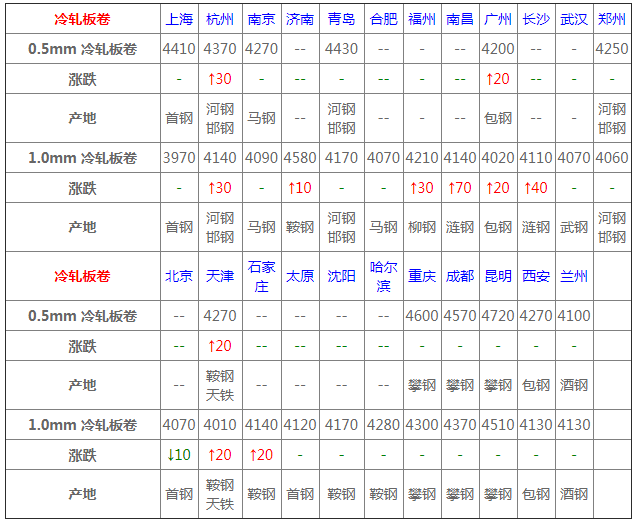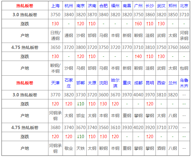 熱卷24個(gè)市場(chǎng)中12個(gè)市場(chǎng)上漲10-30,1個(gè)市場(chǎng)下跌10,4.75熱軋板卷平均價(jià)格3747元/噸,較上個(gè)交易日上調(diào)11元/噸;