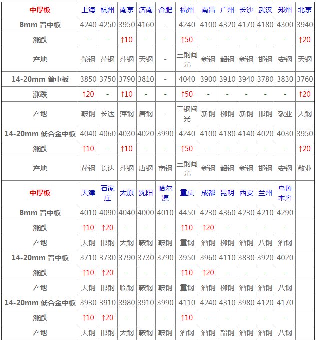 中板24個(gè)市場(chǎng)中8個(gè)市場(chǎng)上漲10-50,14-20mm普中板平均價(jià)格3859元/噸,較上個(gè)交易日上調(diào)9元/噸。